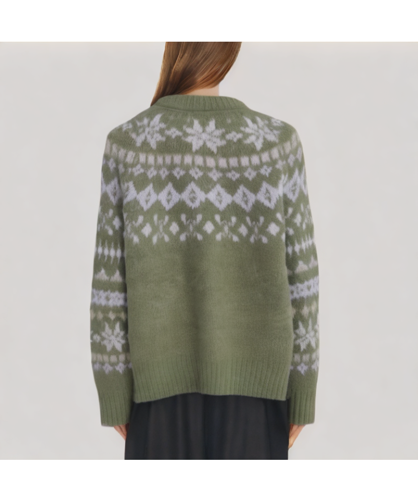 Contrasting Snowflake Jacquard Pattern: The front of the sweater features a contrasting snowflake jacquard design, enriching the visual layers and adding a festive winter feel and a touch of fashion. The exquisite jacquard craftsmanship and clear, three-dimensional texture make the sweater both warm and a unique design highlight, becoming a visual focal point.