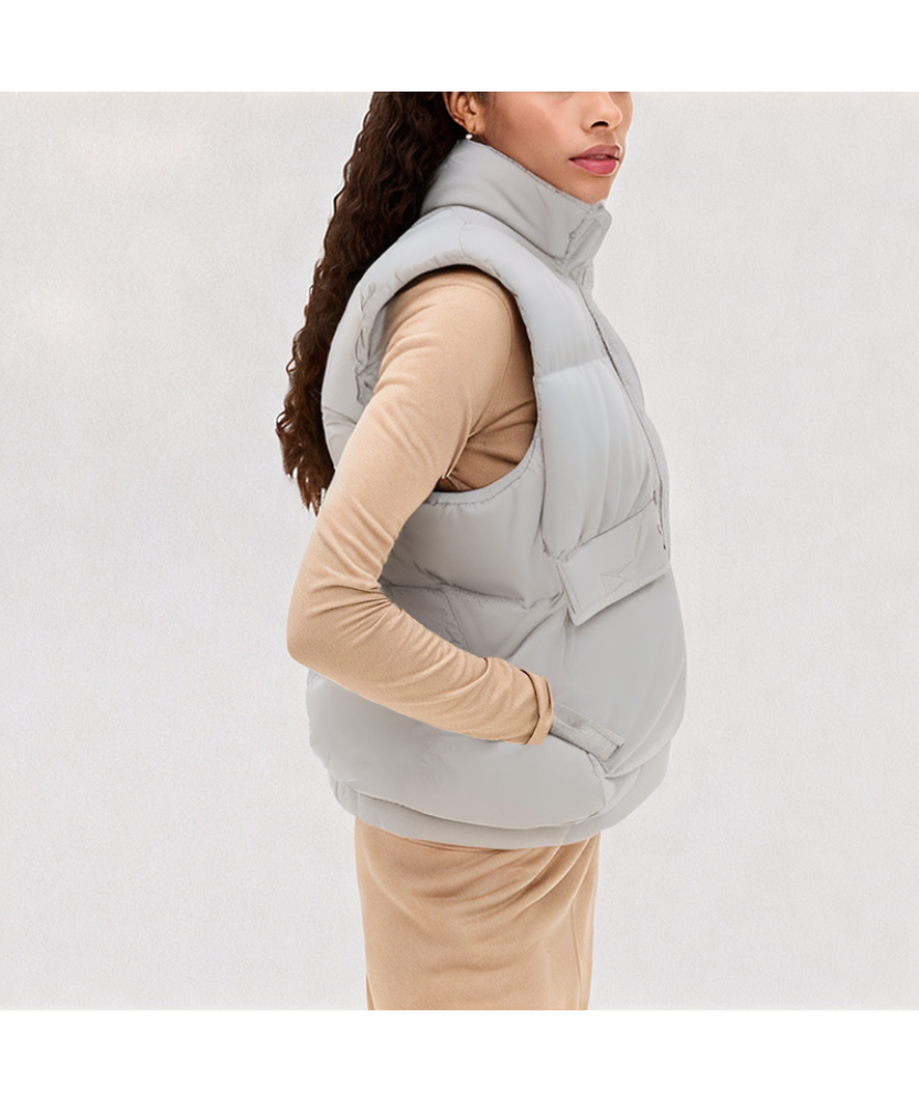 Material and Craftsmanship: This down vest uses high-density windproof fabric, which is crisp and soft to the touch. It offers good wind resistance and basic water repellency, making it suitable for everyday wear and light outdoor activities in autumn and winter. The vest is filled with high-quality white duck down, which is fluffy, lightweight, and provides excellent warmth. The entire vest features fine quilting, with even and strong stitching to effectively secure the down filling, prevent down leakage, and maintain a full and crisp short silhouette. A smooth and durable zipper closure at the front makes it easy to put on and take off, while also enhancing windproof and warmth.