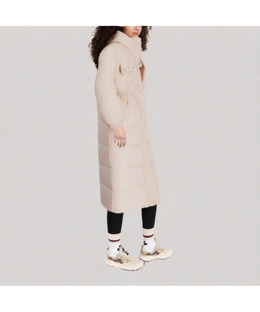 Hooded Design: The practical hooded design, combined with the stand-up collar, provides dual protection for the head and neck, enhancing overall comfort in cold winds or low temperatures. The hood's shape fits snugly and naturally, ensuring a stable fit without slipping. The hood enhances the down jacket's warmth while creating visual balance with the slim-fit long silhouette, combining practicality and style.