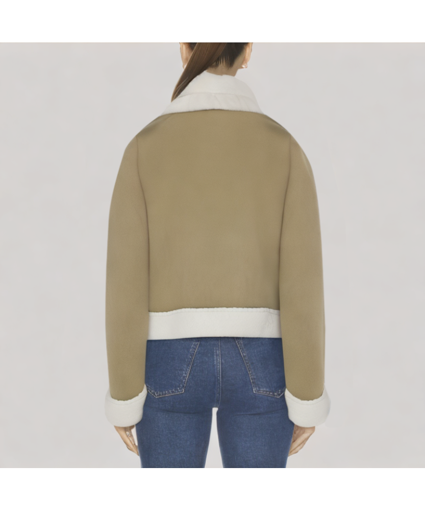 Material and Craftsmanship: The jacket is made of soft and delicate suede fabric, smooth to the touch, highly durable, and visually presenting a retro texture. The lining is fully covered with lambswool, thick and soft, offering superior warmth. The suede outer layer and lambswool lining are combined and secured through a meticulous splicing process, ensuring durability and preventing shedding. The placket features a toggle button design, adding a touch of detail and complementing the retro suede texture. The overall short silhouette is structured and lightweight yet highly warm.