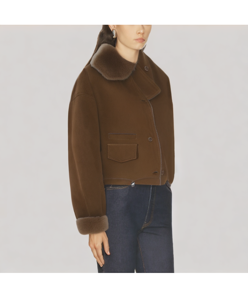 Material and Craftsmanship: This coat features a reversible design, combining sheepskin and suede. One side is soft, thick sheepskin, providing a comfortable and warm wearing experience; the other side is smooth and durable suede, offering excellent windproof performance. The coat is finely crafted with even and strong stitching, ensuring it maintains its shape even after long-term wear.