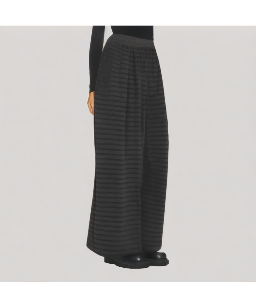 Striped Design and Visual Effect: The striped design on the pants visually lengthens the leg lines, enhancing the overall proportions. Stripes are simple and versatile, adding a touch of style while complementing the wide-leg cut, highlighting the design and layering of the trousers.