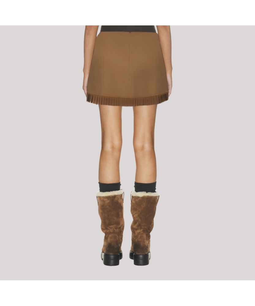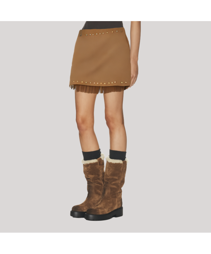 Material and Craftsmanship: The skirt is made of high-quality suede fabric, soft and smooth to the touch, warm in texture, and possessing a retro and sophisticated feel. The overall stitching is exquisite and even, the skirt has a crisp and structured shape, and is durable and comfortable. The fringe and rivet embellishments at the hem are meticulously crafted, showcasing a heavy-duty texture and design sense, giving the skirt a blend of retro luxury and street style.