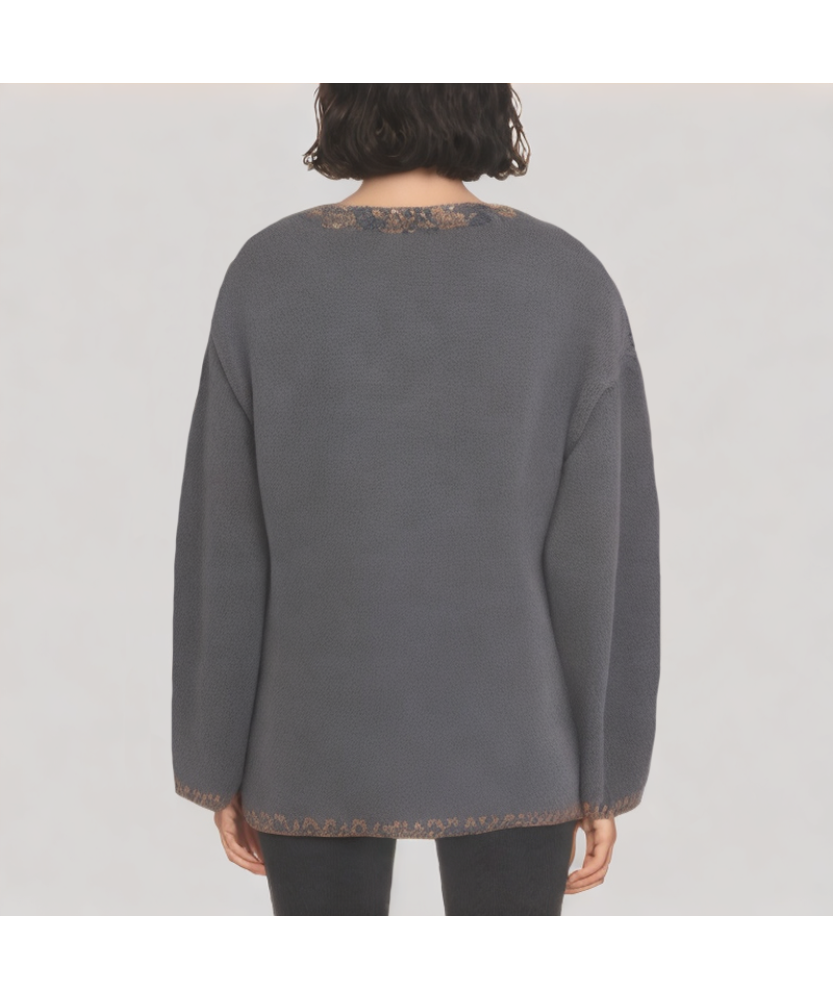 Shimmering Details: Shimmering trim adorns the neckline, hem, and cuffs, subtly adding a touch of sophistication and detail, making the sweater more elegant and unique on a simple grey base.