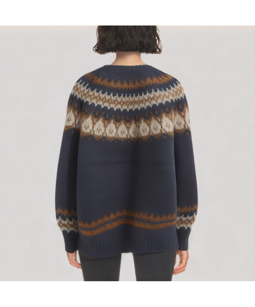 Color and Style: Dark blue is the main color, versatile and easy to wear, suitable for everyday wear in autumn and winter. The color-blocked jacquard pattern adds a touch of vibrancy, creating a casual, stylish, and warm look suitable for everyday outings, casual parties, or school attire.