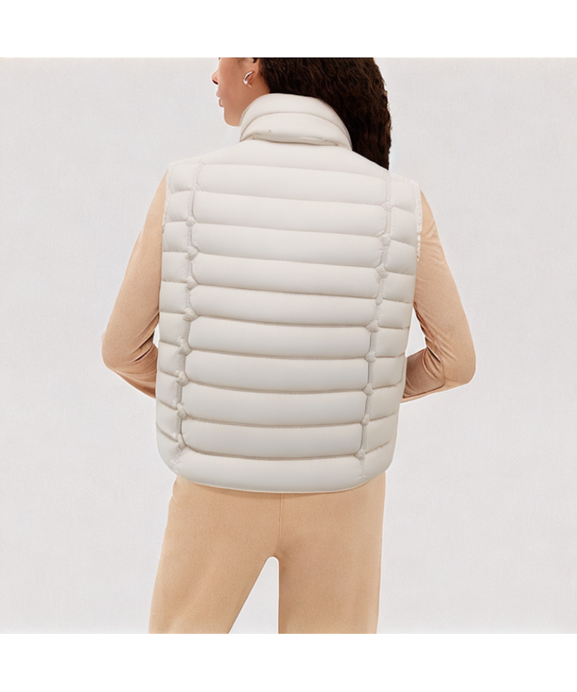 Quilted Design: Evenly distributed quilting lines throughout the body securely hold the down, reducing cold spots. The quilted structure enhances the garment's structure, making this short vest both fluffy and warm, as well as flattering and stylish.