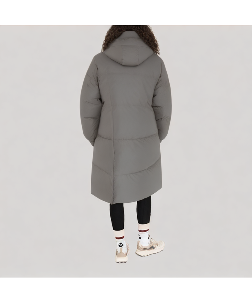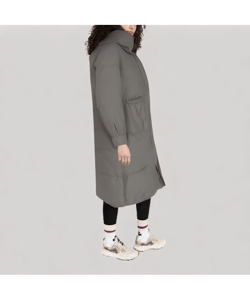 Quilting design: The down jacket features a regular quilting structure with fine, even stitches, effectively securing the down filling and reducing displacement, enhancing warmth retention. The rhythmic quilting lines add layers and a three-dimensional visual effect, making the mid-length silhouette more flattering. The overall quilting presents a simple and elegant style, achieving a good balance between aesthetics and functionality.