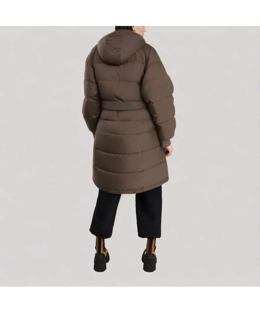 Hooded Design: The hooded design, combined with the stand-up collar, provides double protection for the head and neck against the cold wind. The hood fits naturally, ensuring a secure and comfortable fit without slipping. The hood enhances the overall coverage and warmth, while the belt and mid-length cut create an elegant and practical winter look.