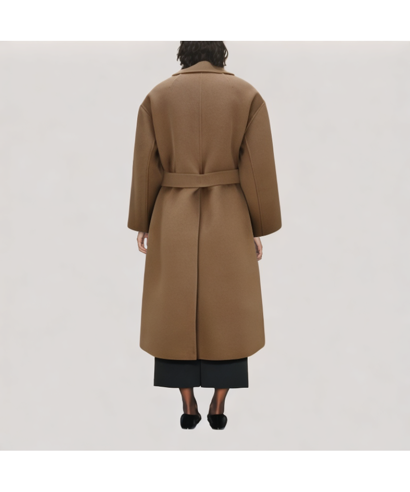 The coat is thoughtfully tailored, with smooth lines and perfectly designed shoulders and waist, creating a relaxed yet refined silhouette. Its classic long design makes it easy to style for work, casual outings, or special occasions.