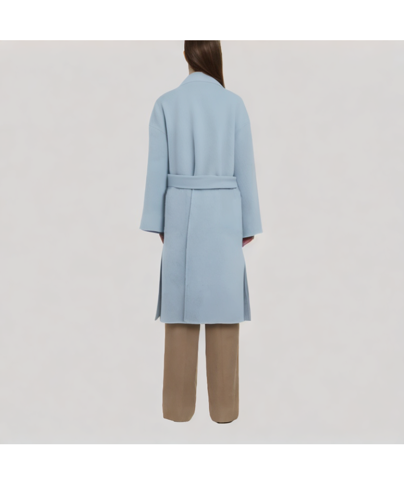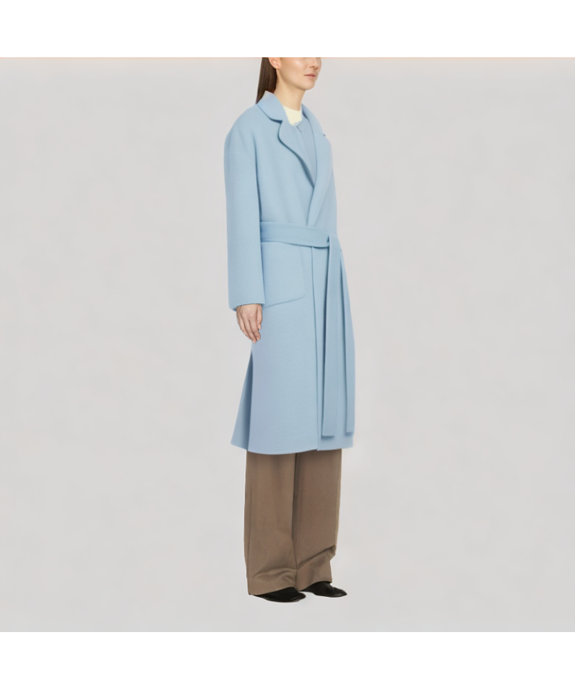 Featuring a classic double-breasted design with an adjustable belt, the coat accentuates the waistline to create an elegant silhouette while maintaining a clean and polished look. The long-length cut enhances body proportions with smooth lines, delivering a sophisticated and timeless appearance.